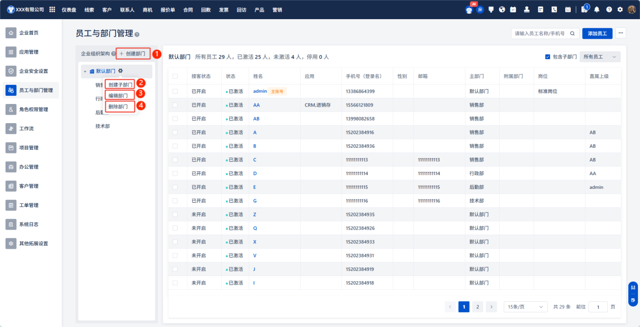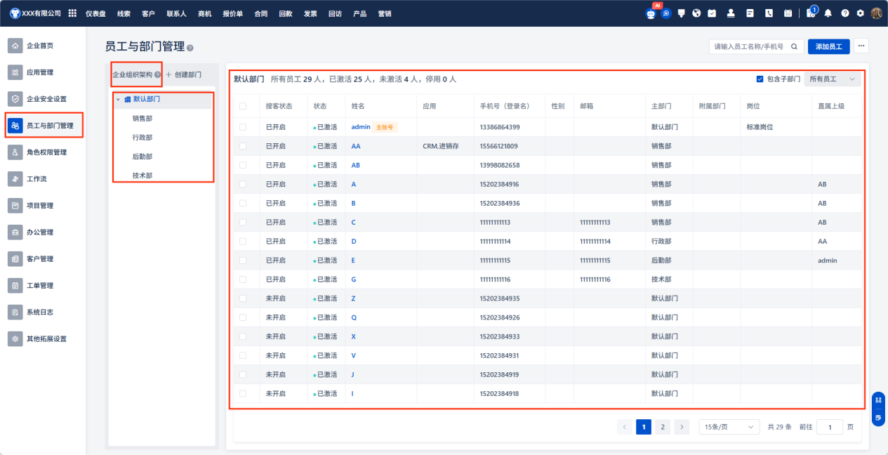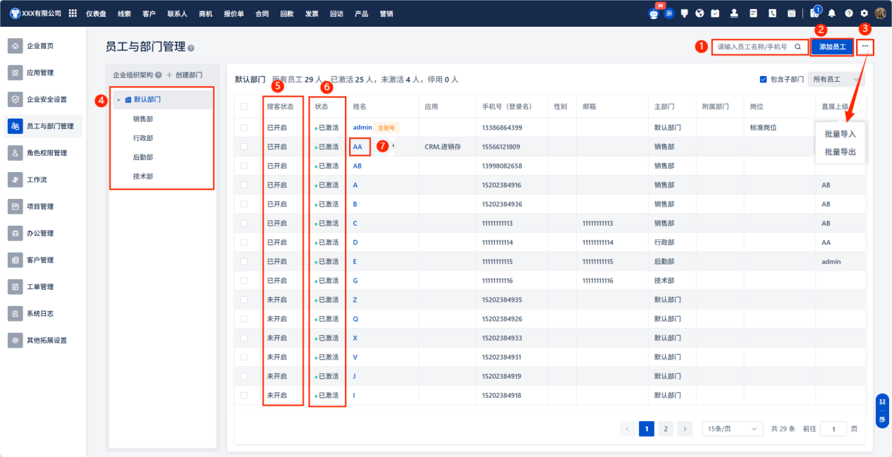 员工管理中,系统默认创建企业的账号为超级管理员(admin),用户可以根据企业需要更改名称。员工管理包括员工的查询,筛选,增加,修改,导入,禁用,激活,重置密码,重置登录账号等。
