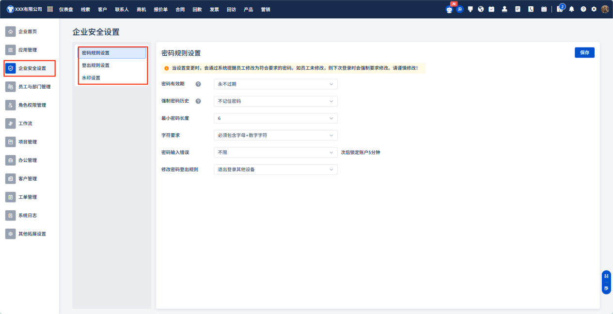 此页面支持密码规则设置、登出规则设置、水印设置。