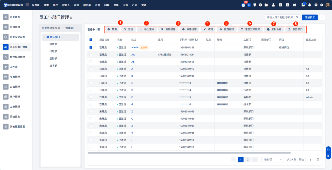 单选员工后可进行以下操作七种操作,多选员工只可选择禁用/激活、重置密码、编辑角色、重置部门四种操作。