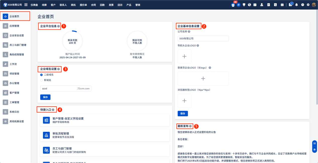 ③企业二级域名修改:修改后生成企业唯一域名,员工可通过此域名登录企业CRM系统。