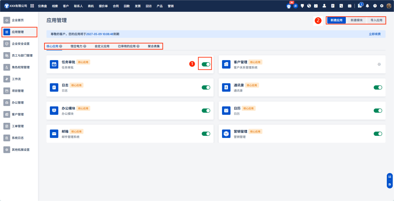 应用模块分为:任务审批、日志、通讯录、客户管理、日历、人力资源管理、财务管理。点击每个版块的①处进行操作(客户管理模块不支持停用)。