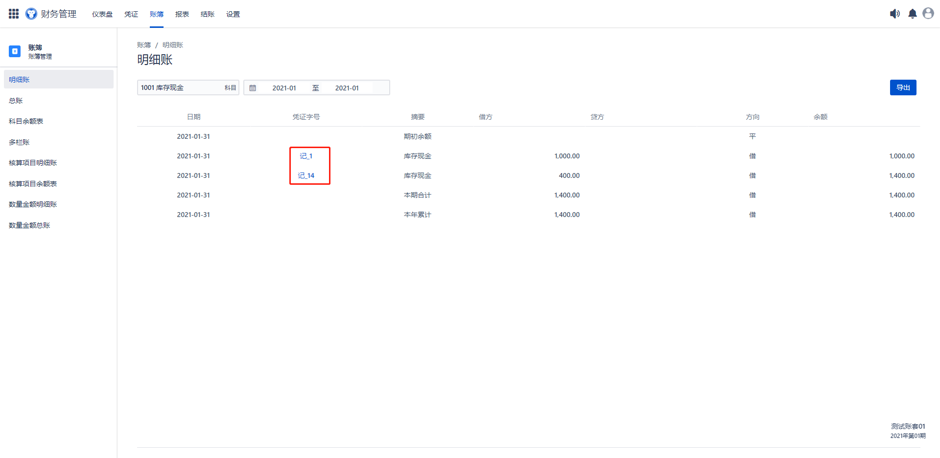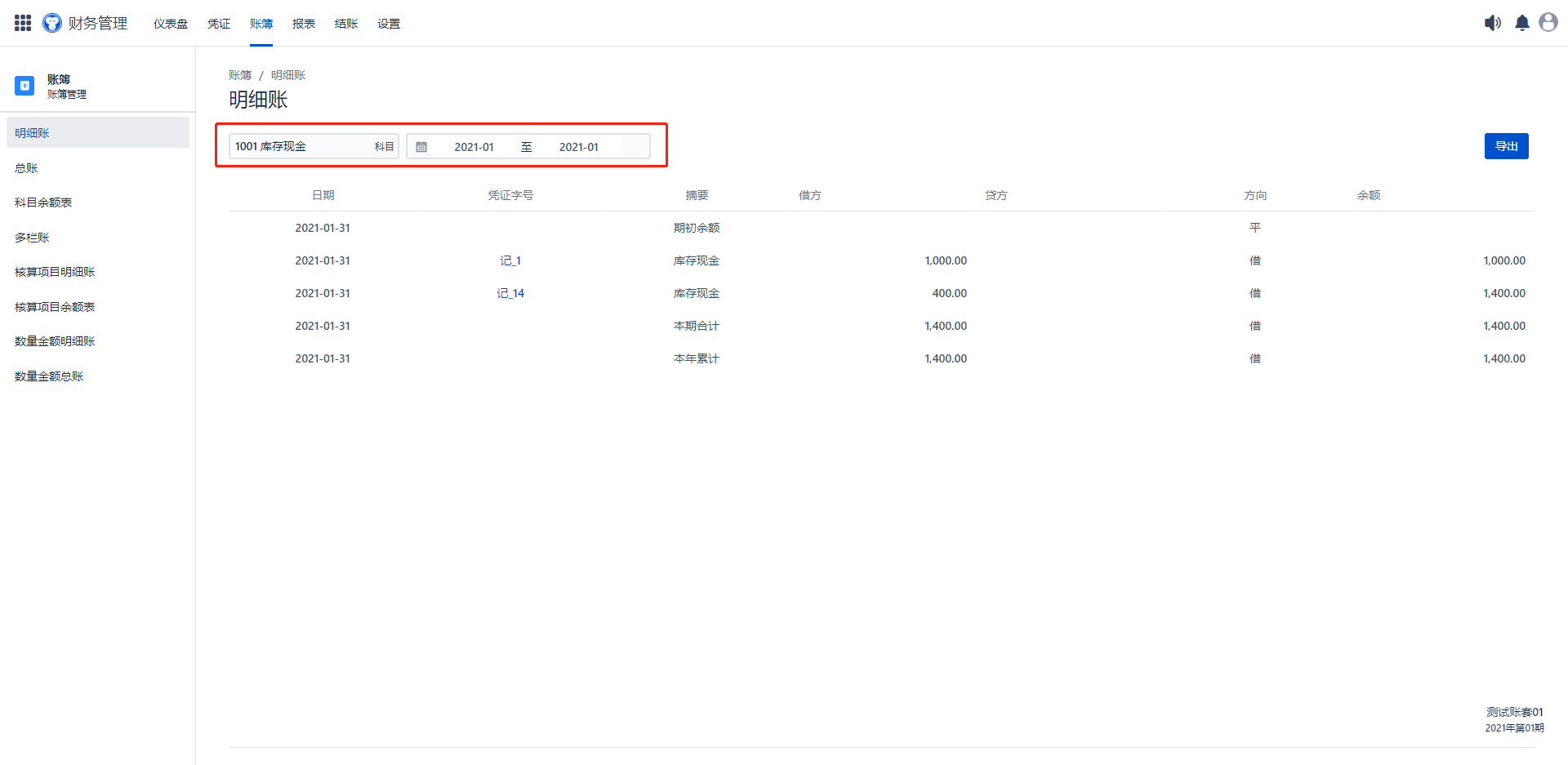 明细账是指按照科目维度展示每个科目下相关产生的凭证详细情况,可以根据科目、会计时间筛选相关的凭证信息。