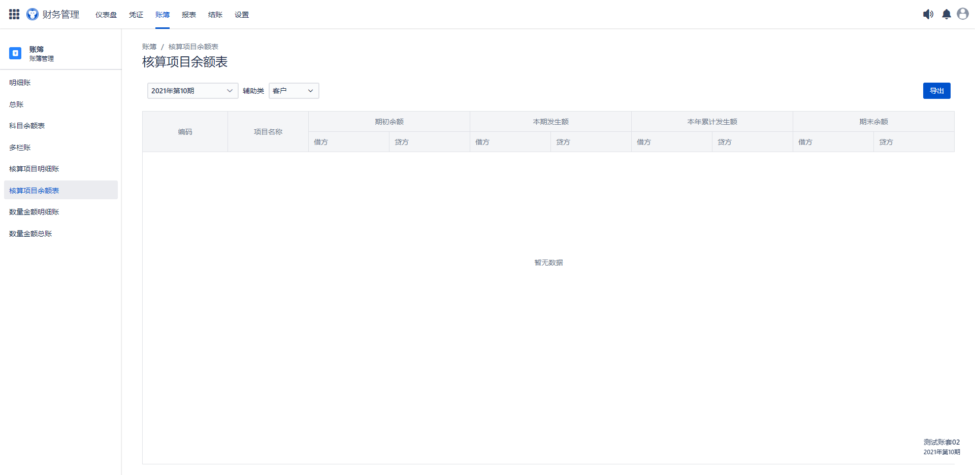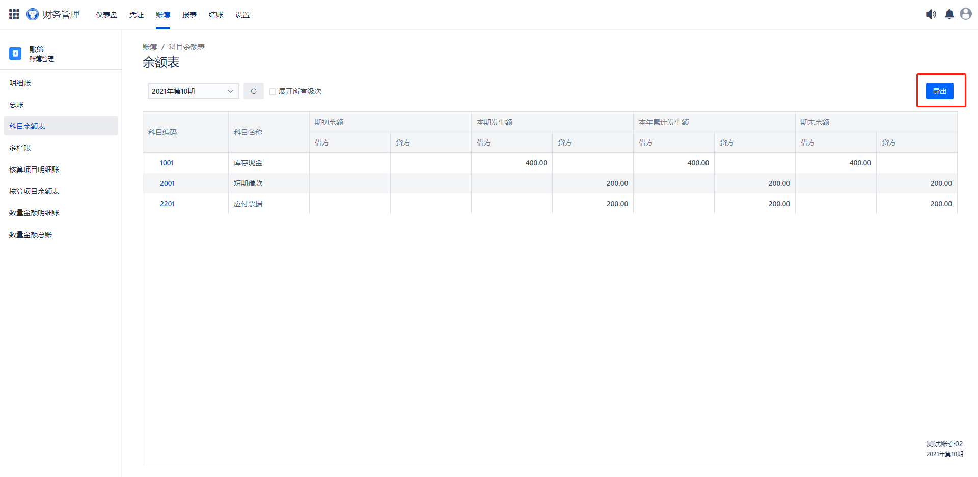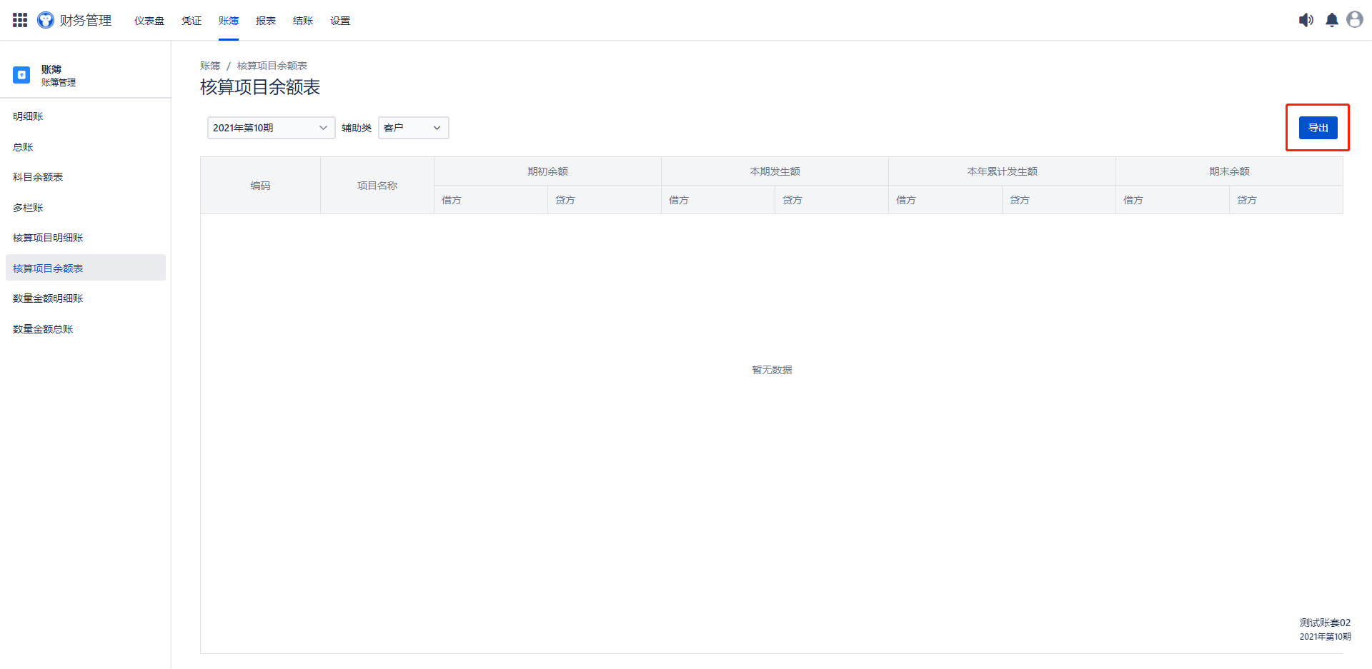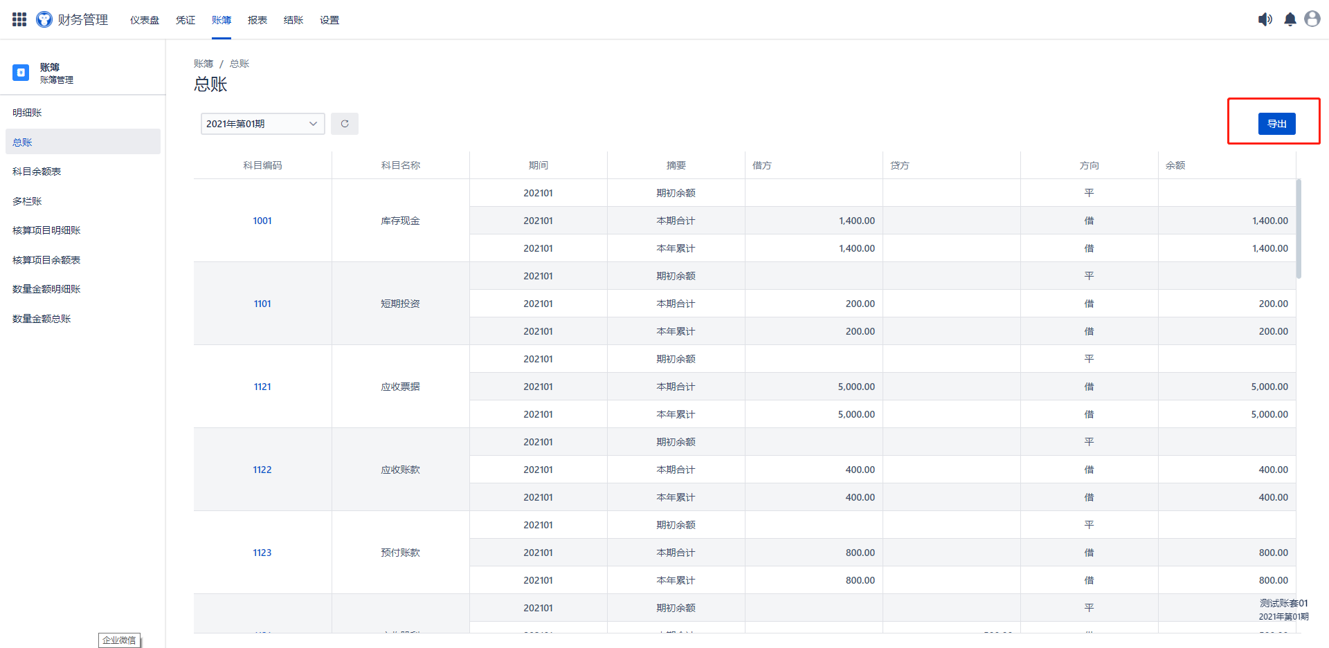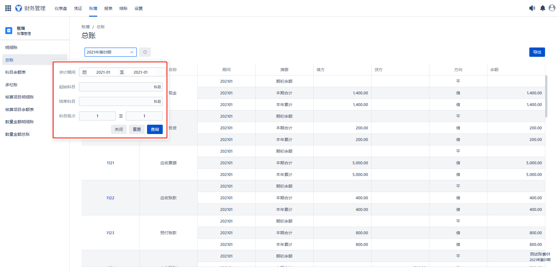 在系统右上角点击「导出」则系统会导出筛选条件下的会计区间和科目的全部数据。