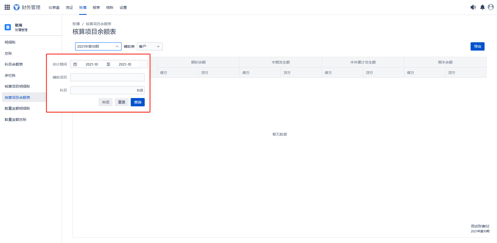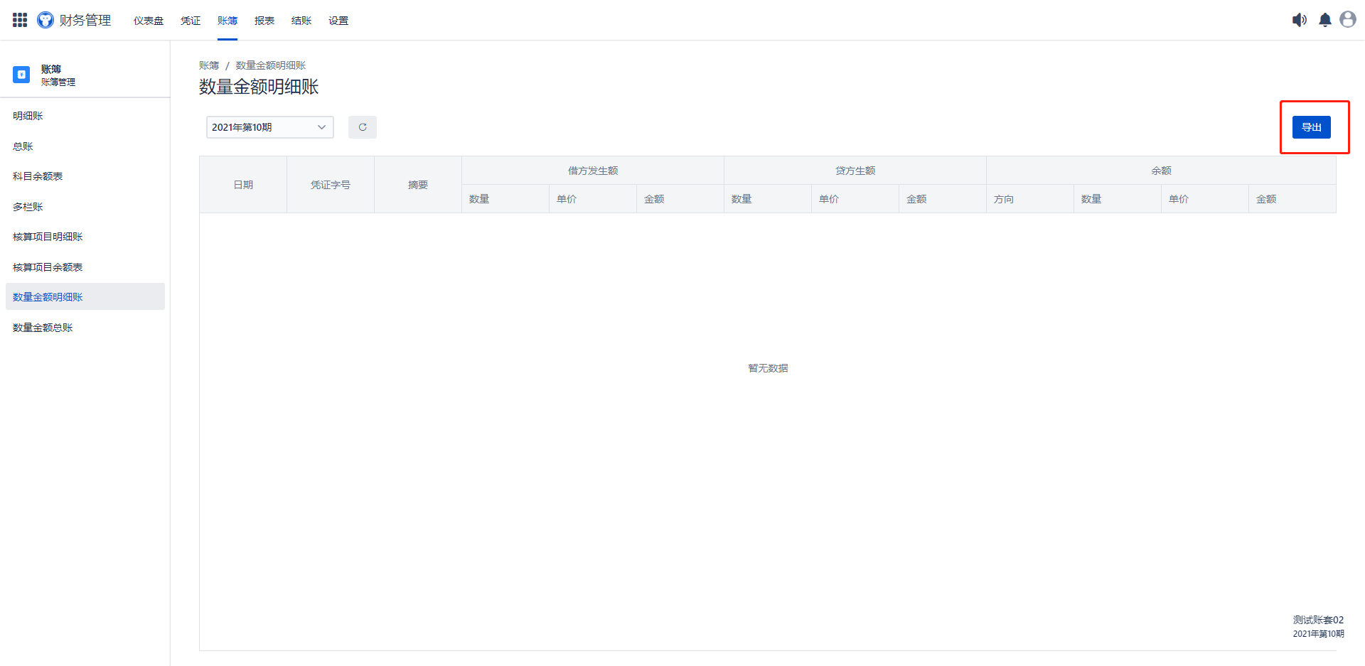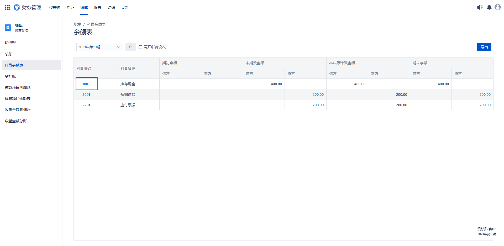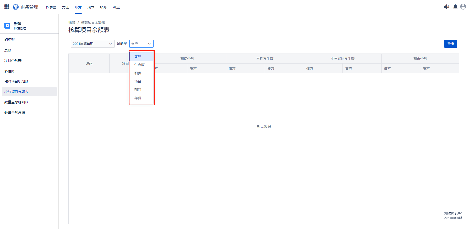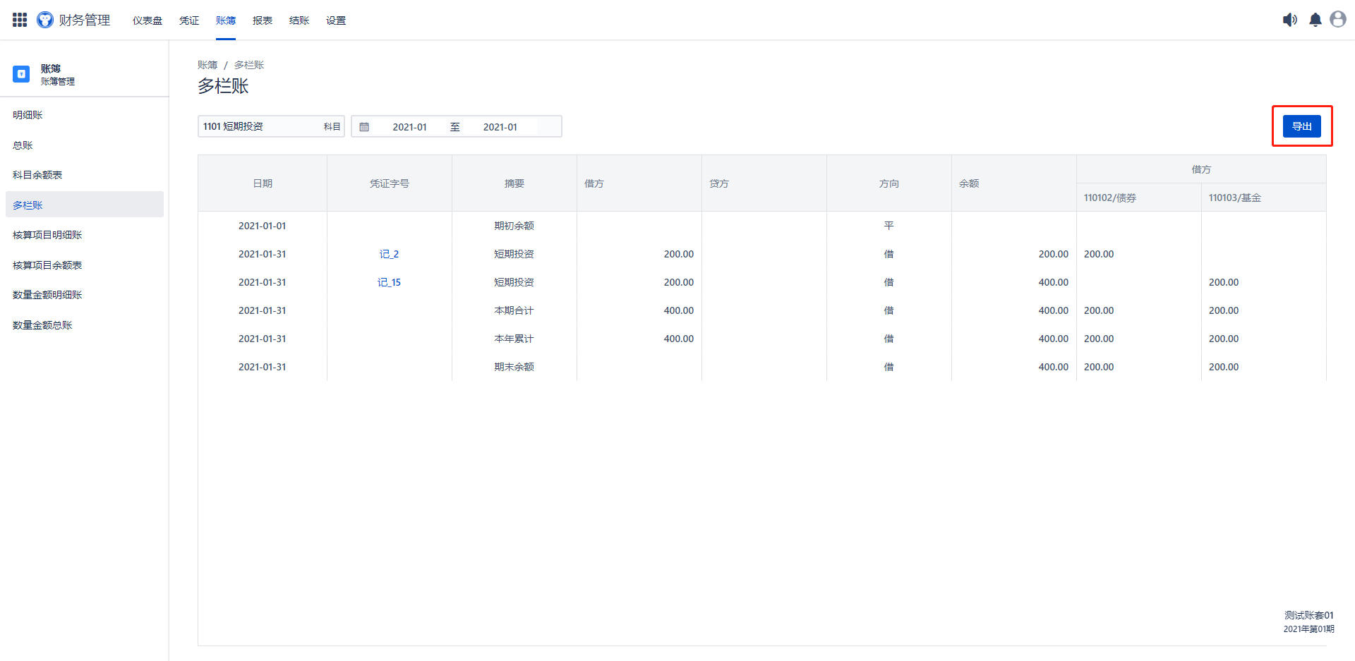 在系统右上角点击「导出」则系统会导出筛选条件下的会计区间和科目的全部数据。