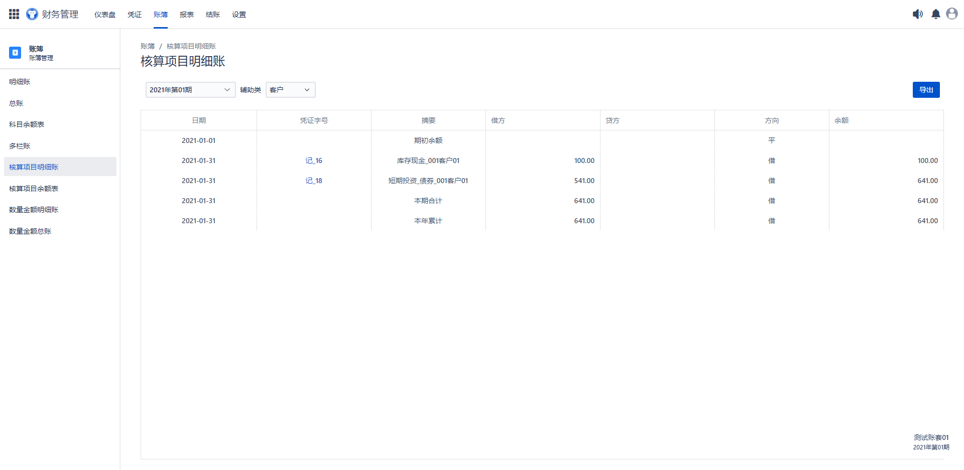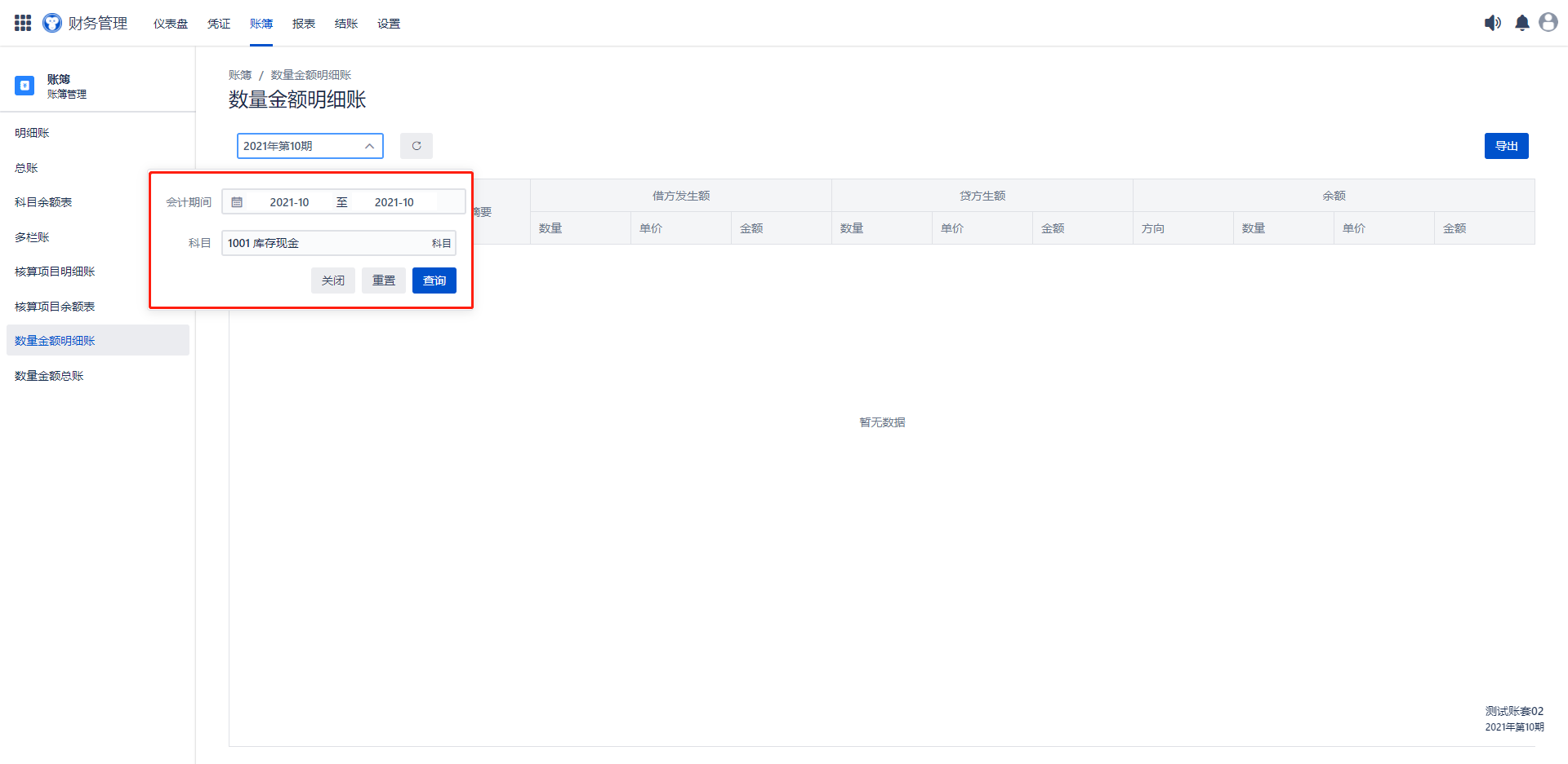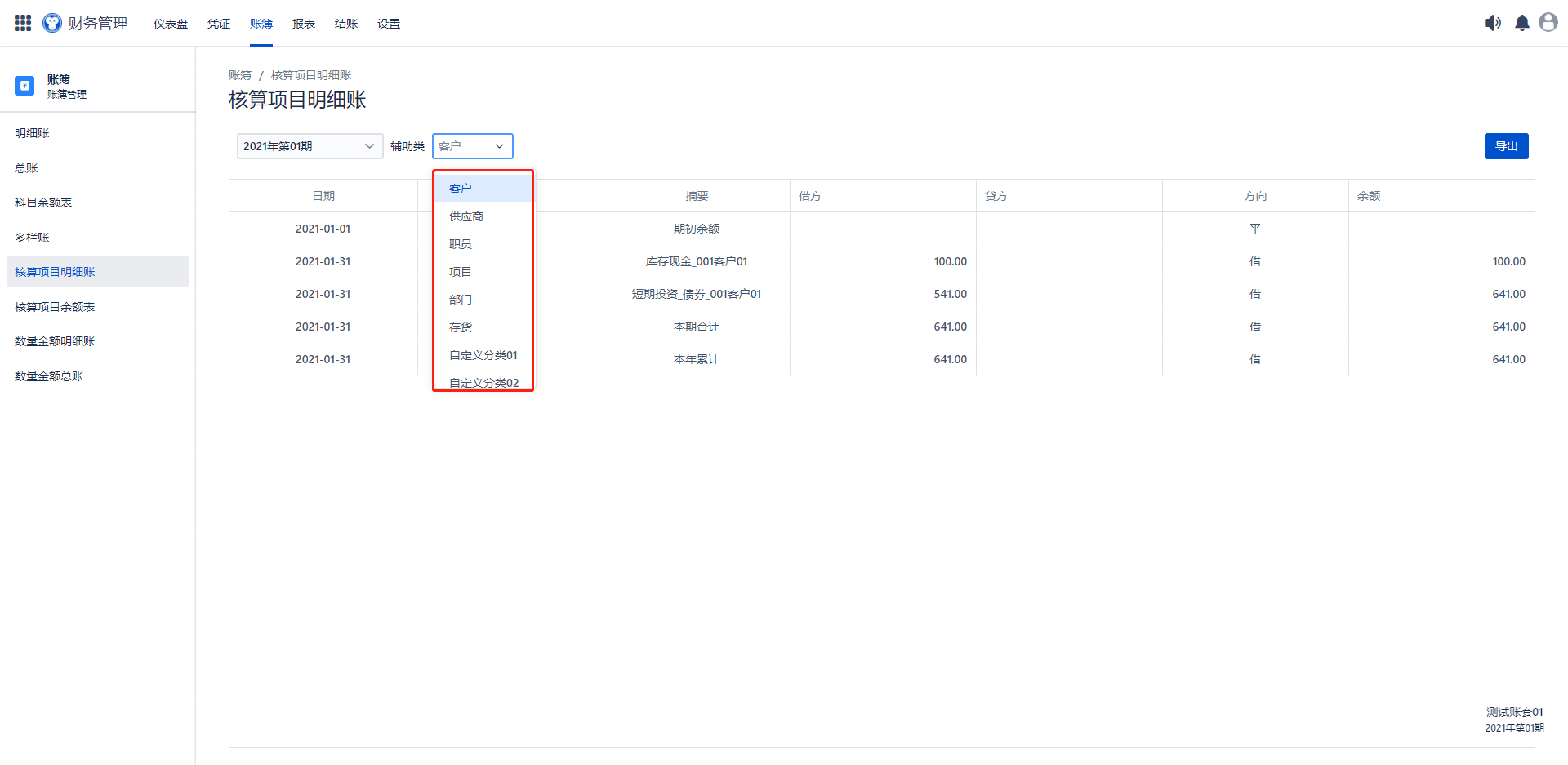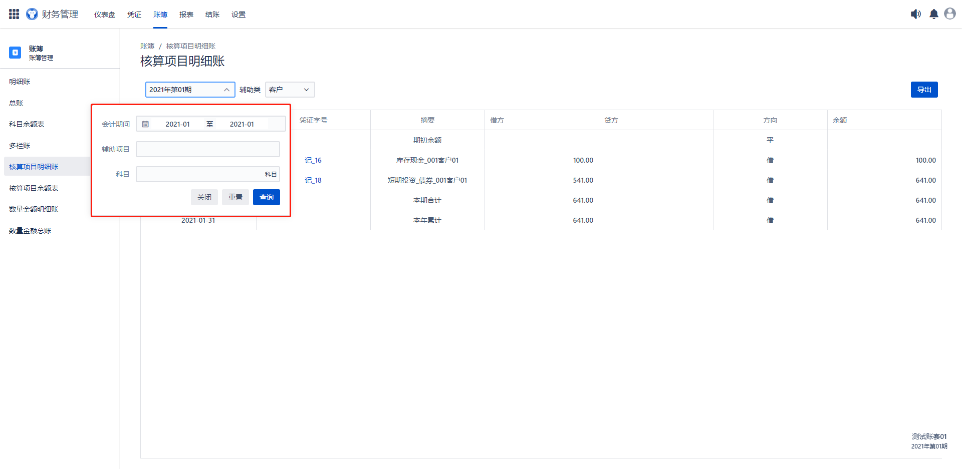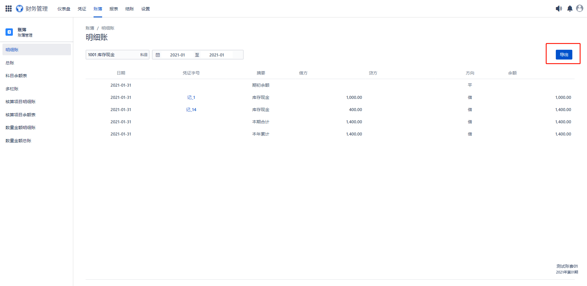 在系统右上角点击「导出」则系统会导出筛选条件下的会计区间和科目的全部数据。