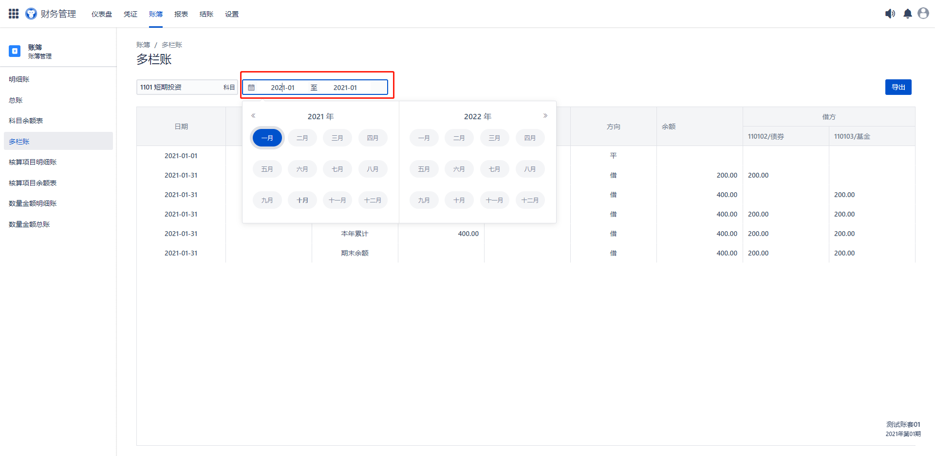多栏账列表默认只展示本期会计期间的筛选条件。筛选会计期间只可筛选存在凭证的会计时间,无凭证的会计间不可筛选。