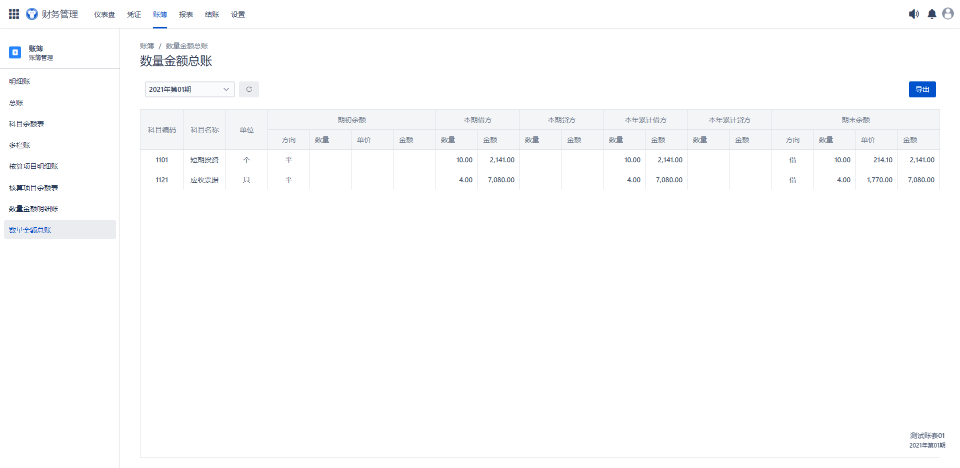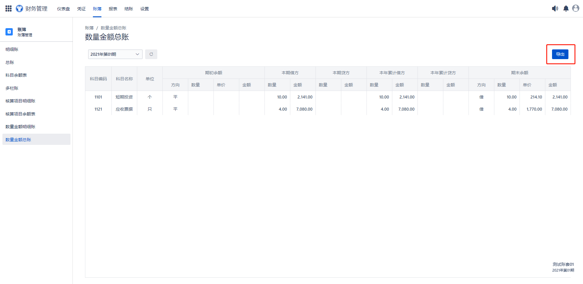 在系统右上角点击「导出」则系统会导出存在数量核算的科目发生凭证的汇总信息数据。