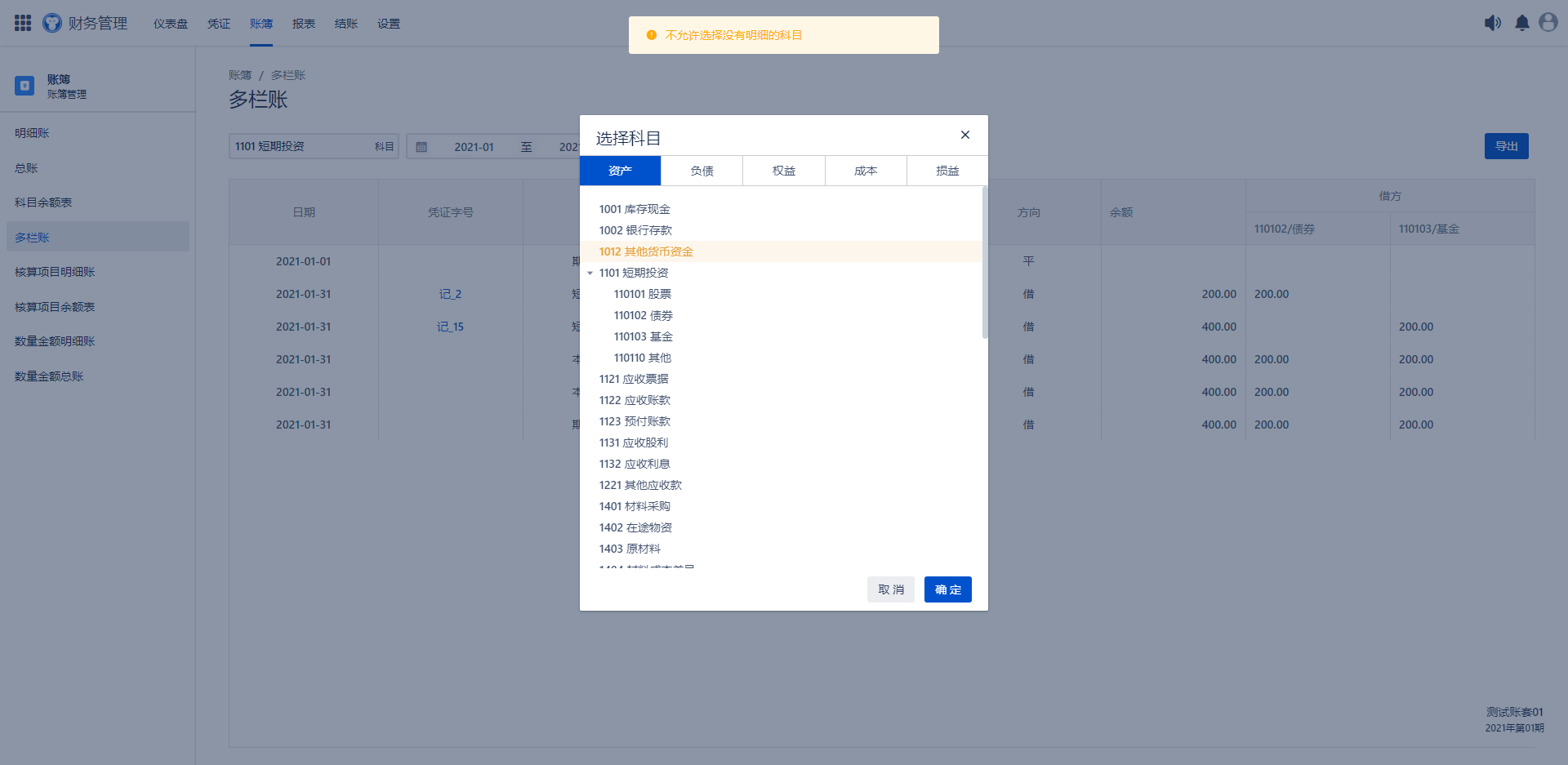 - 多栏账筛选科目只可以筛选显示有下级明细科目的一级科目,若没有下级明细科目则不筛选显示,若选择没有下级的科目,则提示:“不允许选择没有明细的科目!”