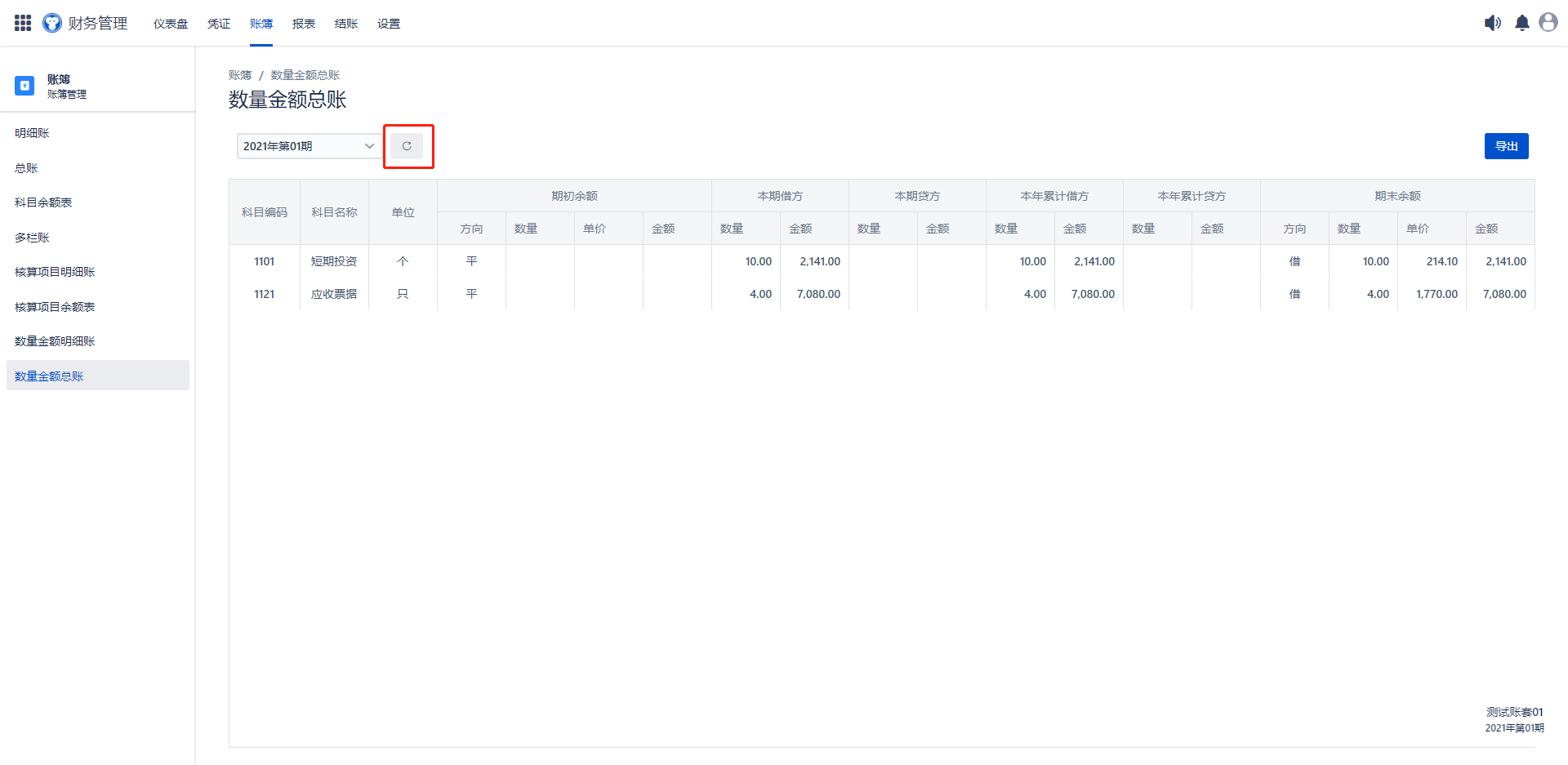 点击数量金额总账表顶部刷新按钮符号,刷新数量金额总账账列表数据,显示为最新数据信息。