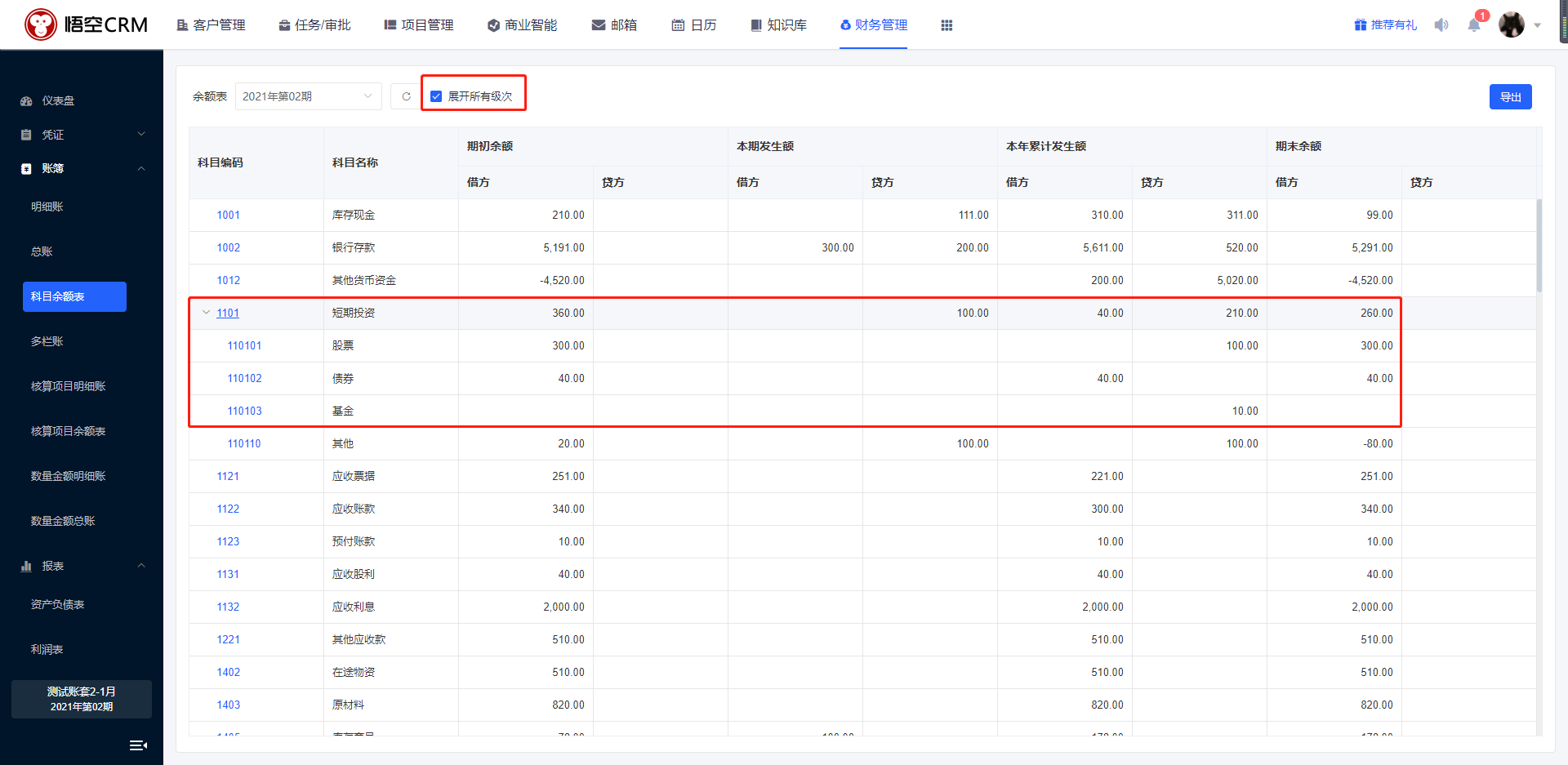 科目余额列表默认显示一级科目,勾线展开所有级次,列表即可展示出所有级次的科目余额数据信息。
