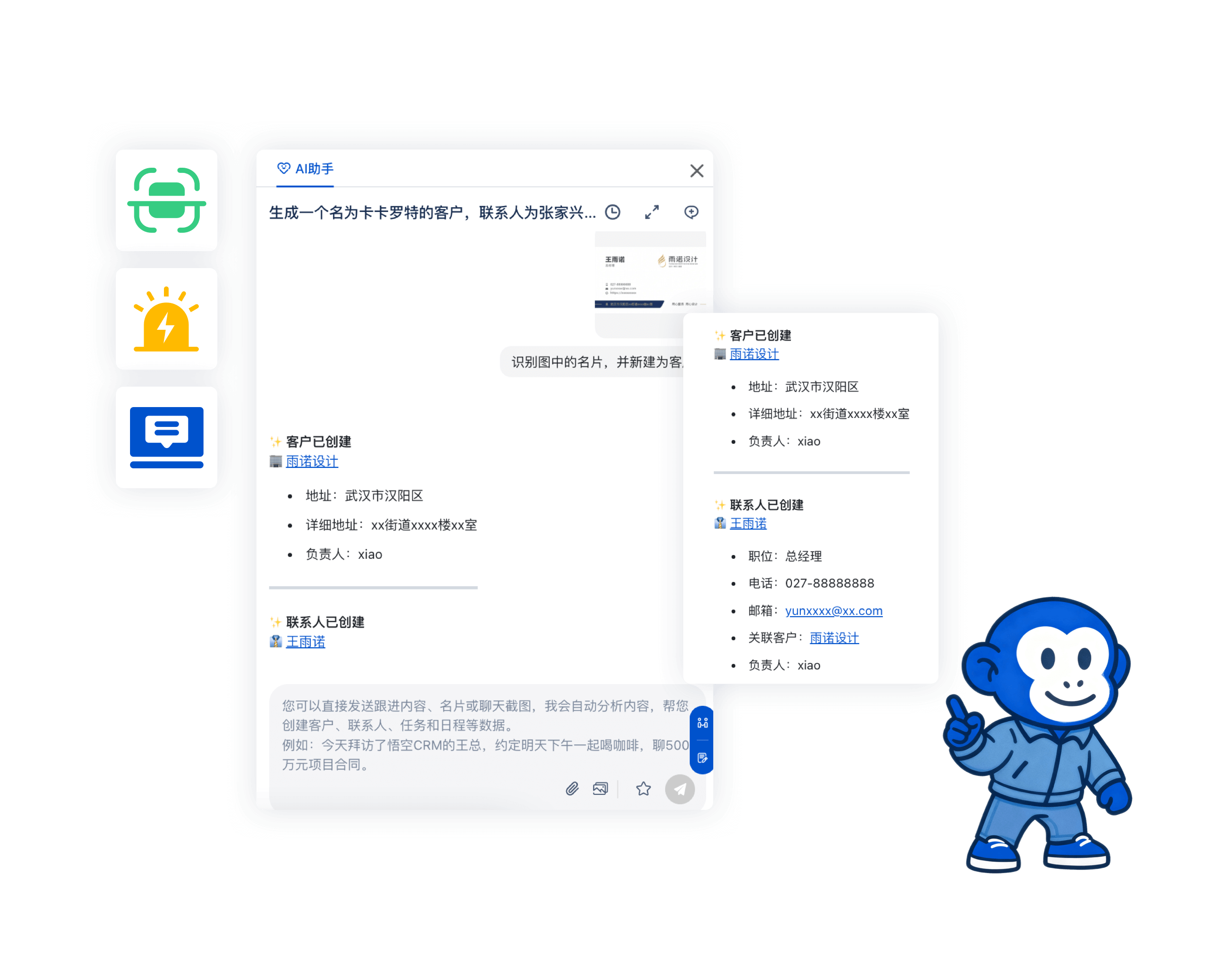 通过自然语言对话即可触发操作,无需点击多模块,直接指令创建客户、跟进记录、商机、合同等数据,系统自动匹配 CRM 字段规范,1 步完成建档,大幅减少手动操作耗时。