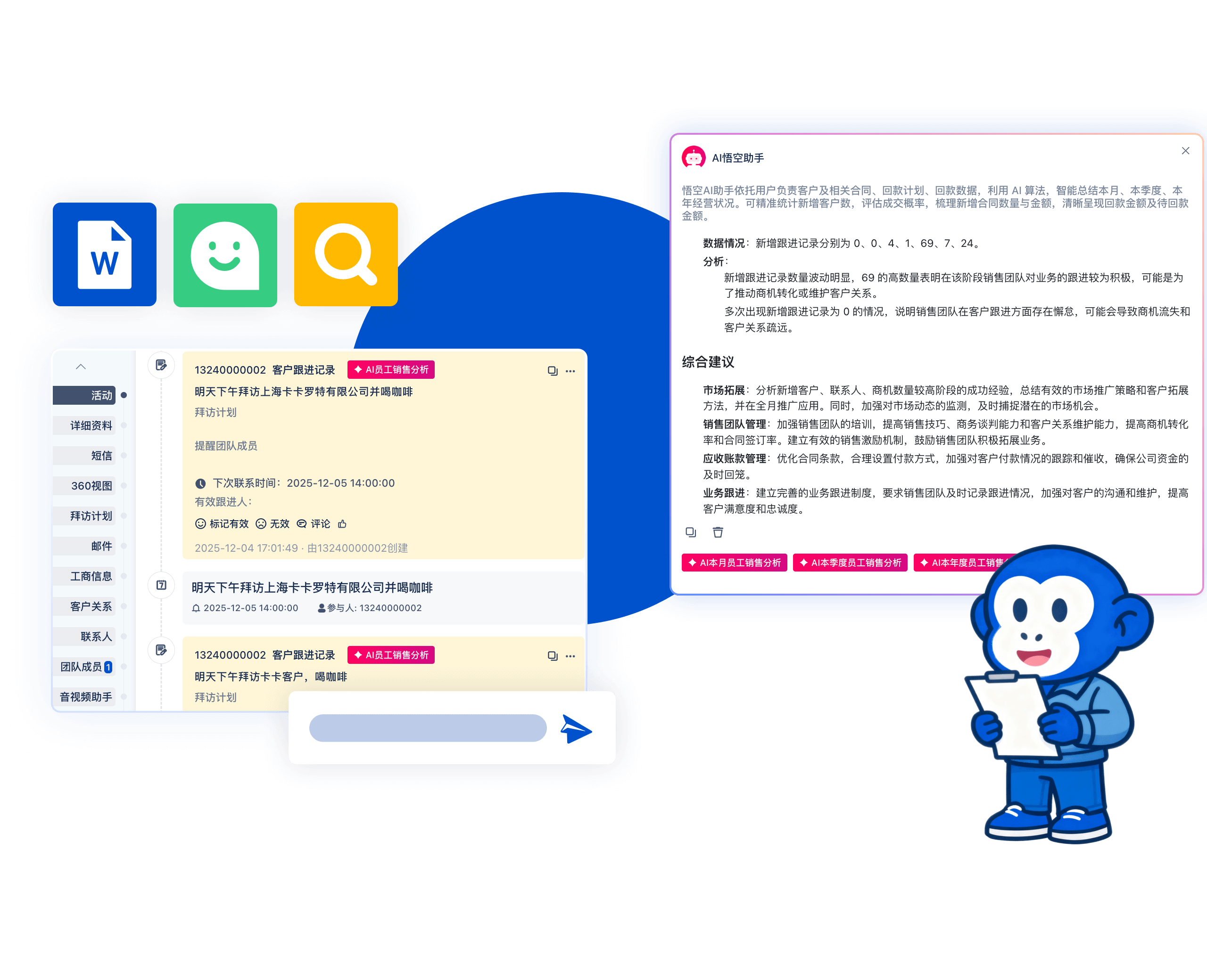 悟空 AI 深度贴合 CRM 全流程,无需复杂配置,即可实现客户、商机、合同等核心数据的自动创建、查找与编辑。支持名片批量录入、销售分析、回款预测及工作文档智能生成,为企业全员减负提效,赋能精准决策